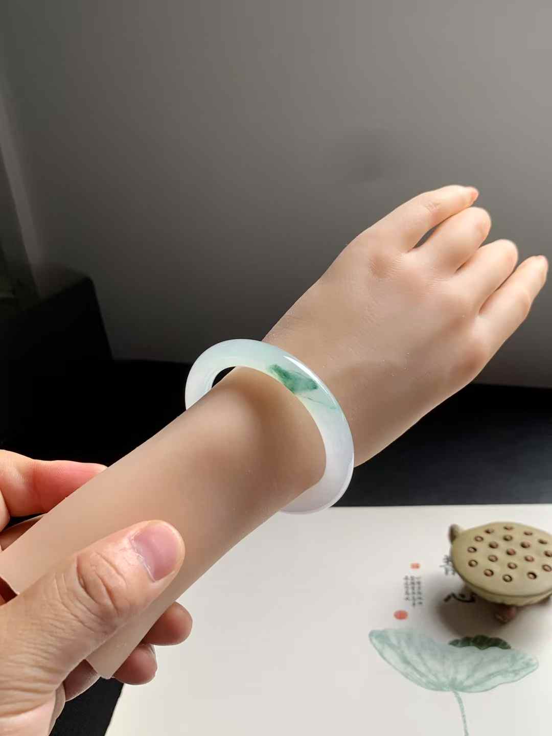 这款冰胶飘花圆条镯,尺寸为50-9.2-9mm,晶莹透亮,质地细腻柔和。飘花纹理自然簇拥,展现深邃清新的美感,整体无纹裂,佩戴舒适,彰显独特品味。