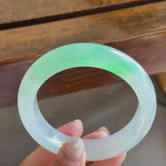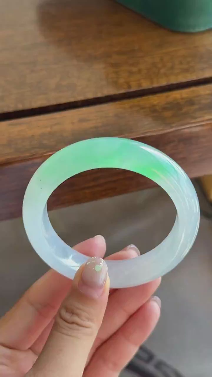 这款冰阳绿正圈手镯,尺寸57-13.3-9.6,完美无瑕,散发着独特的色彩魅力。一抹翠阳绿如春日清晨的第一缕阳光,底色冰透水润,触感细腻。佩戴它,仿佛把自然的清新与活力戴在手腕上,时刻感受生机勃勃的美好。